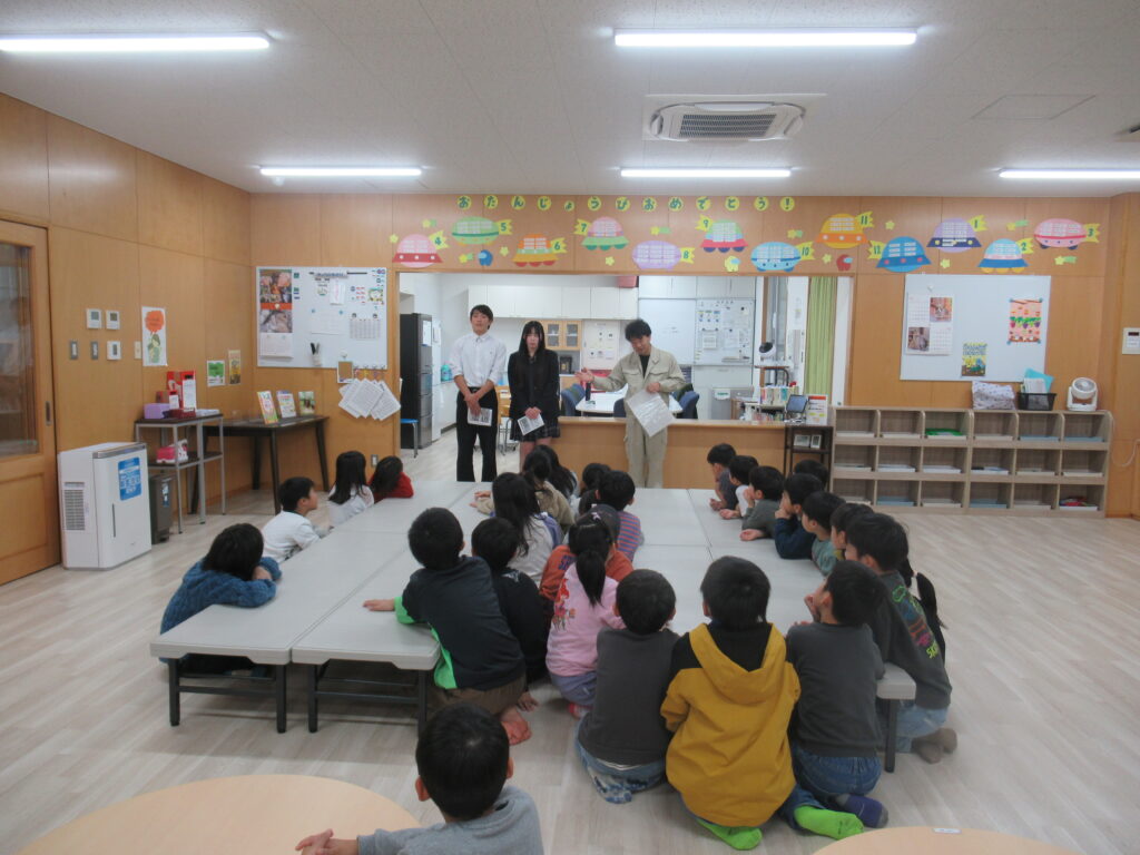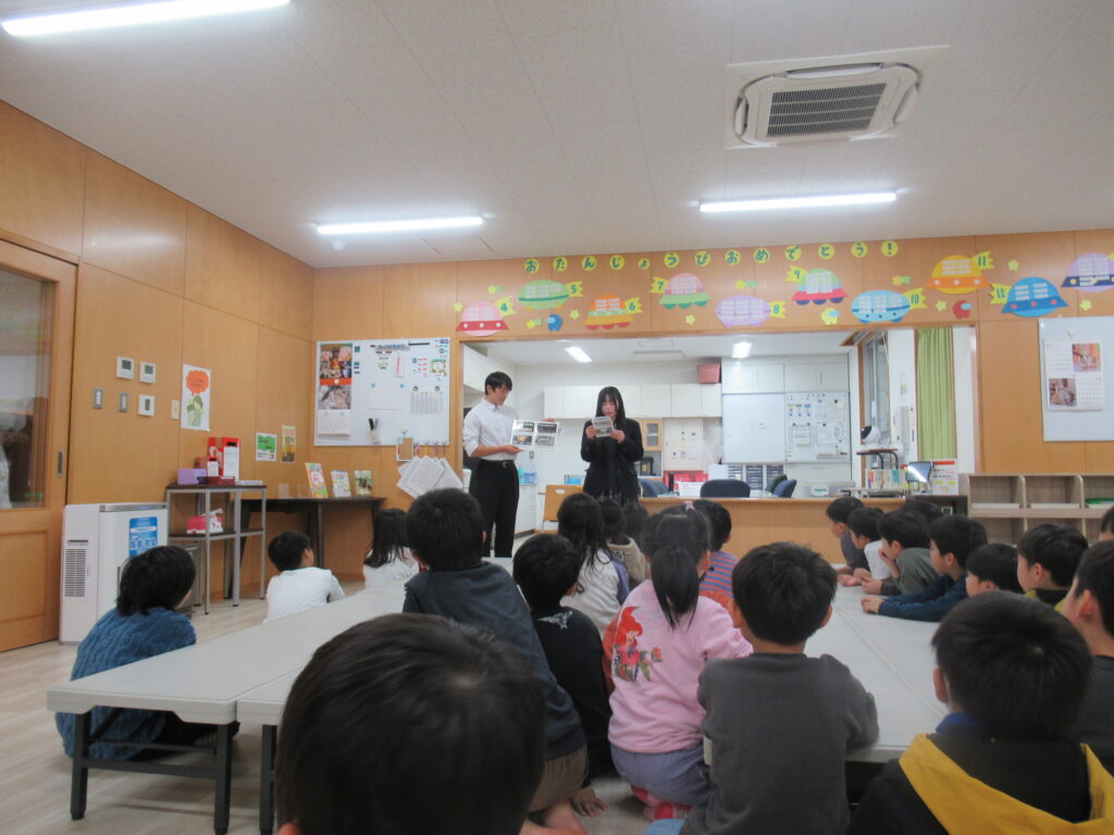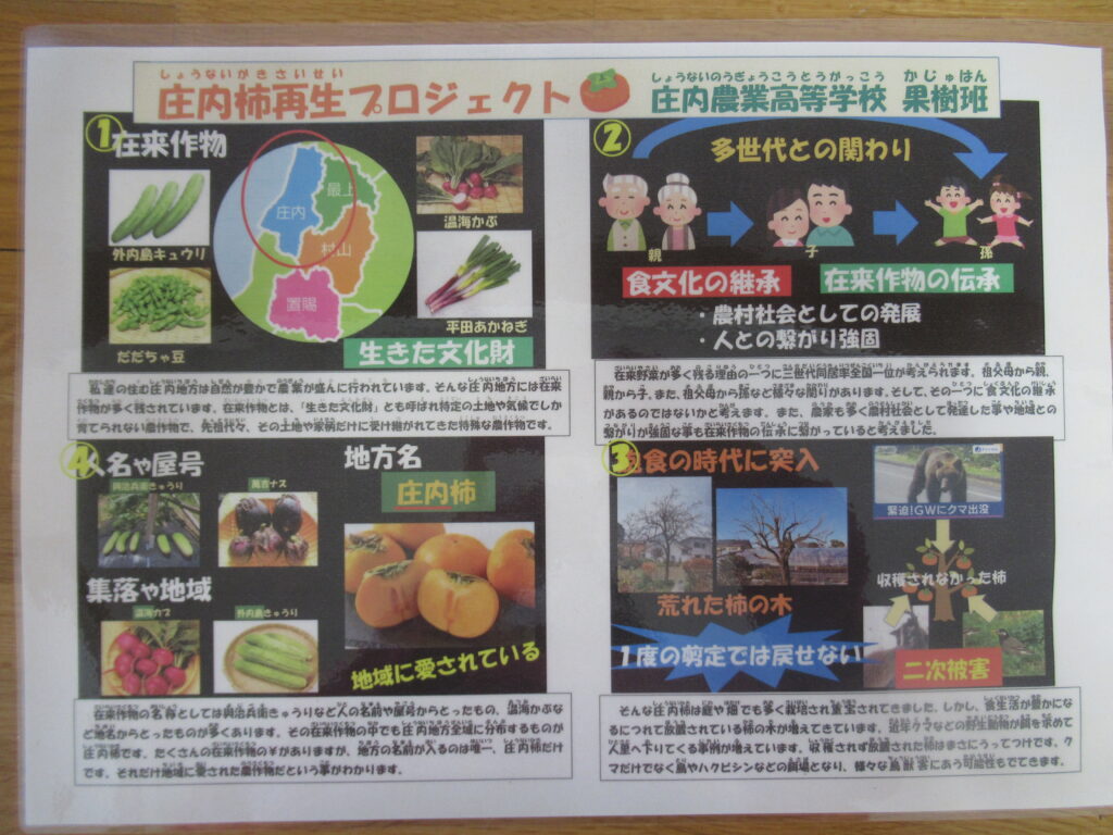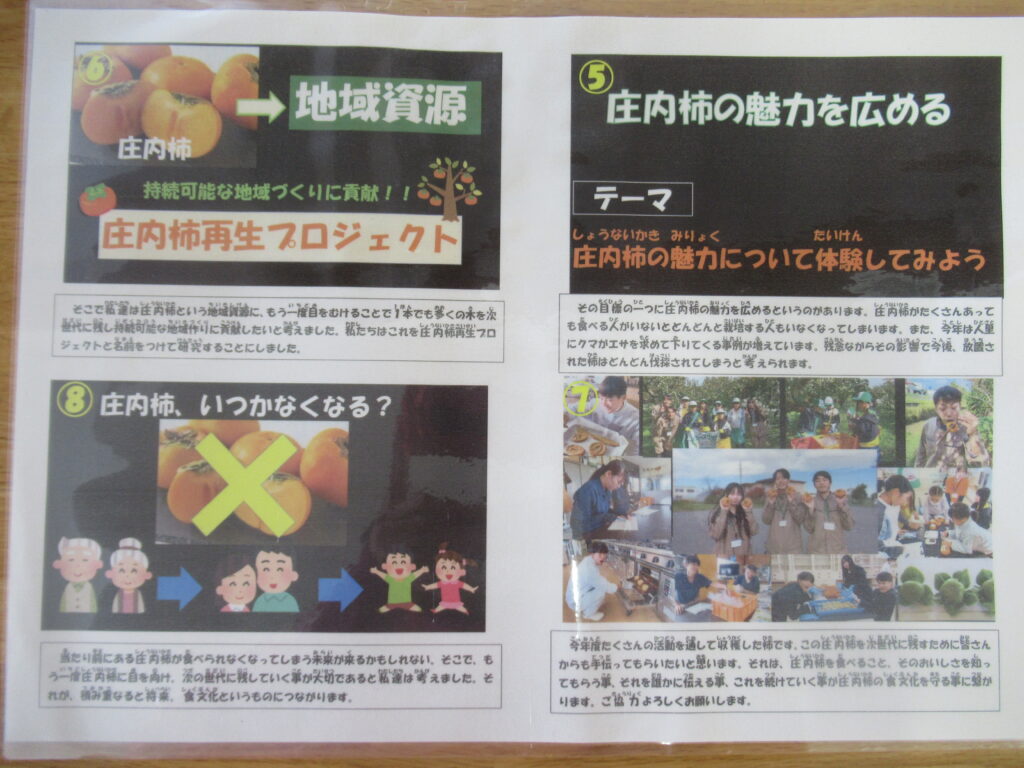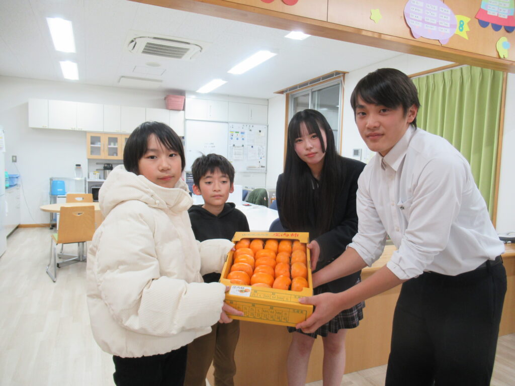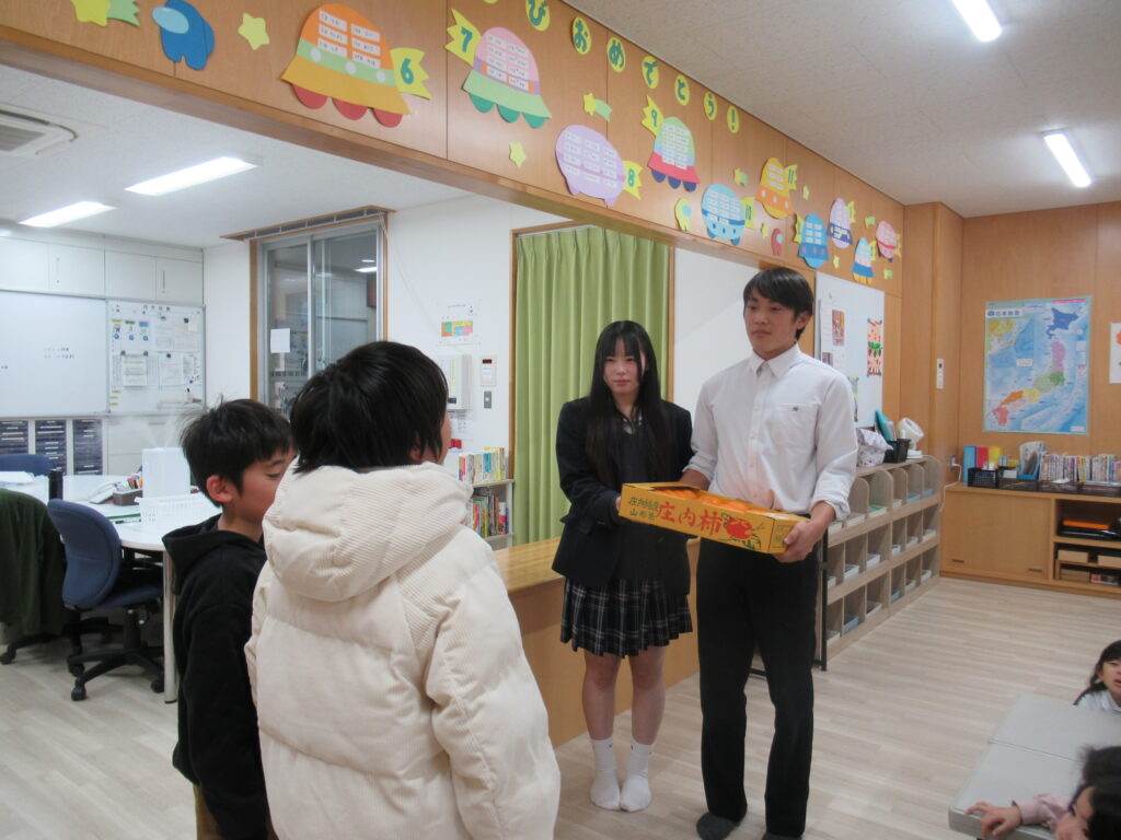 庄内農業高等学校果樹班の先生と生徒2名が来所し庄内柿の美味しさを広める「庄内柿再生プロジェクト」のお話を聞きました。庄内柿の歴史やプロジェクトの内容をわかり易く説明してくれて子どもたちは熱心に聞いていました。最後は子どもたちに庄内柿をいただき、代表の子がお礼の言葉を伝えました。ありがとうございました。